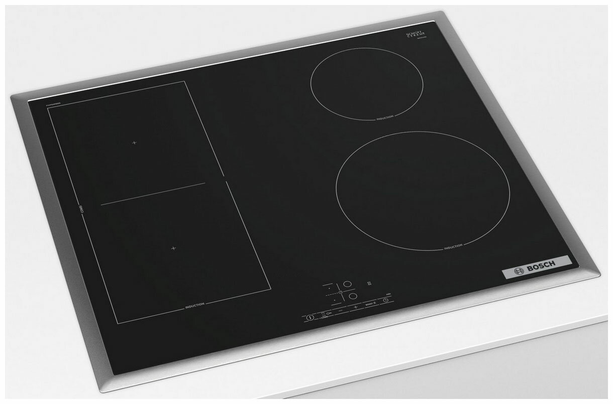 Варочная панель Bosch Serie 4, индукционная 60 см, стеклокерамика, рама из нержавеющей стали, скошенный фронт, 4 конфорки, две конфорки слева можно объединить в CombiZone, управление TouchSelect, таймер, распознавание наличия посуды, функция PowerBoost, и