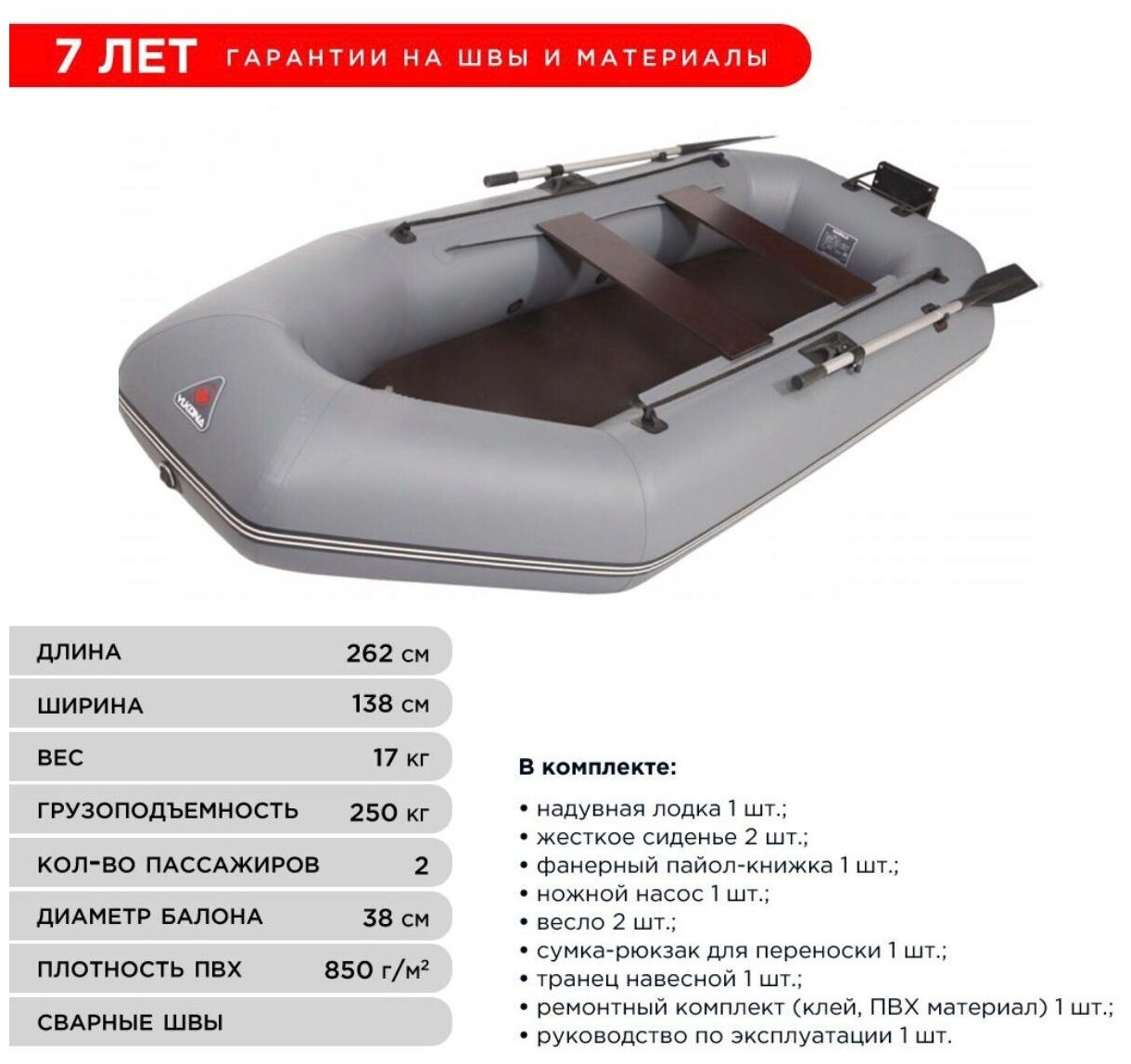 Надувные лодки Надувная гребная лодка ПВХ YUKONA 260 GT под мотор со складным фанерным пайолом, серая