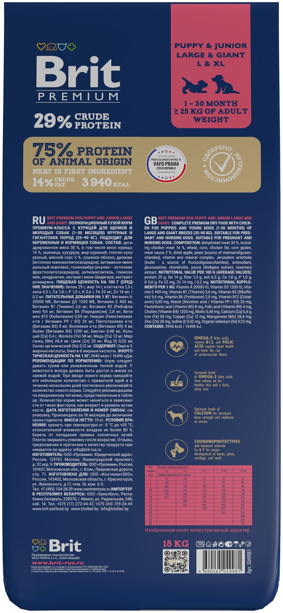Сухой корм BRIT PREMIUM Dog Puppy&Junior Large&Giant 15 кг