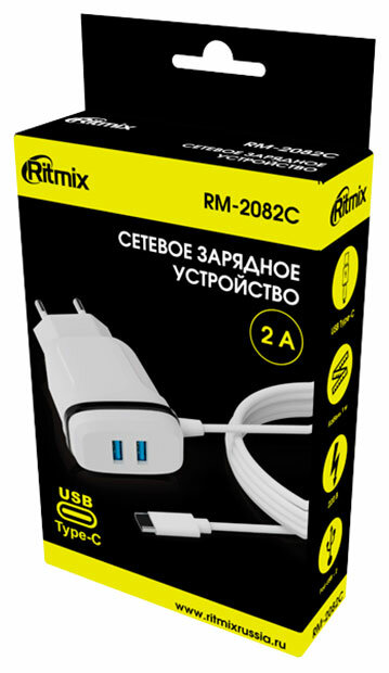 Сетевой адаптер питания зарядка Ritmix RM-2082C 2А 2 USB-порта + кабель USB-C, белый