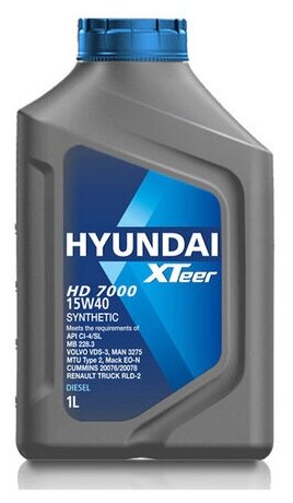 HYUNDAI XTeer HD 7000 15W40, 1 л API CI-4/SL, MB 228.3 MTU Cal.2, Volvo VDS-3 Mack EO-N, RenauB RLD-2 Cummins 20077, MAN 3275-1 SYNTHETIC, Моторное масло