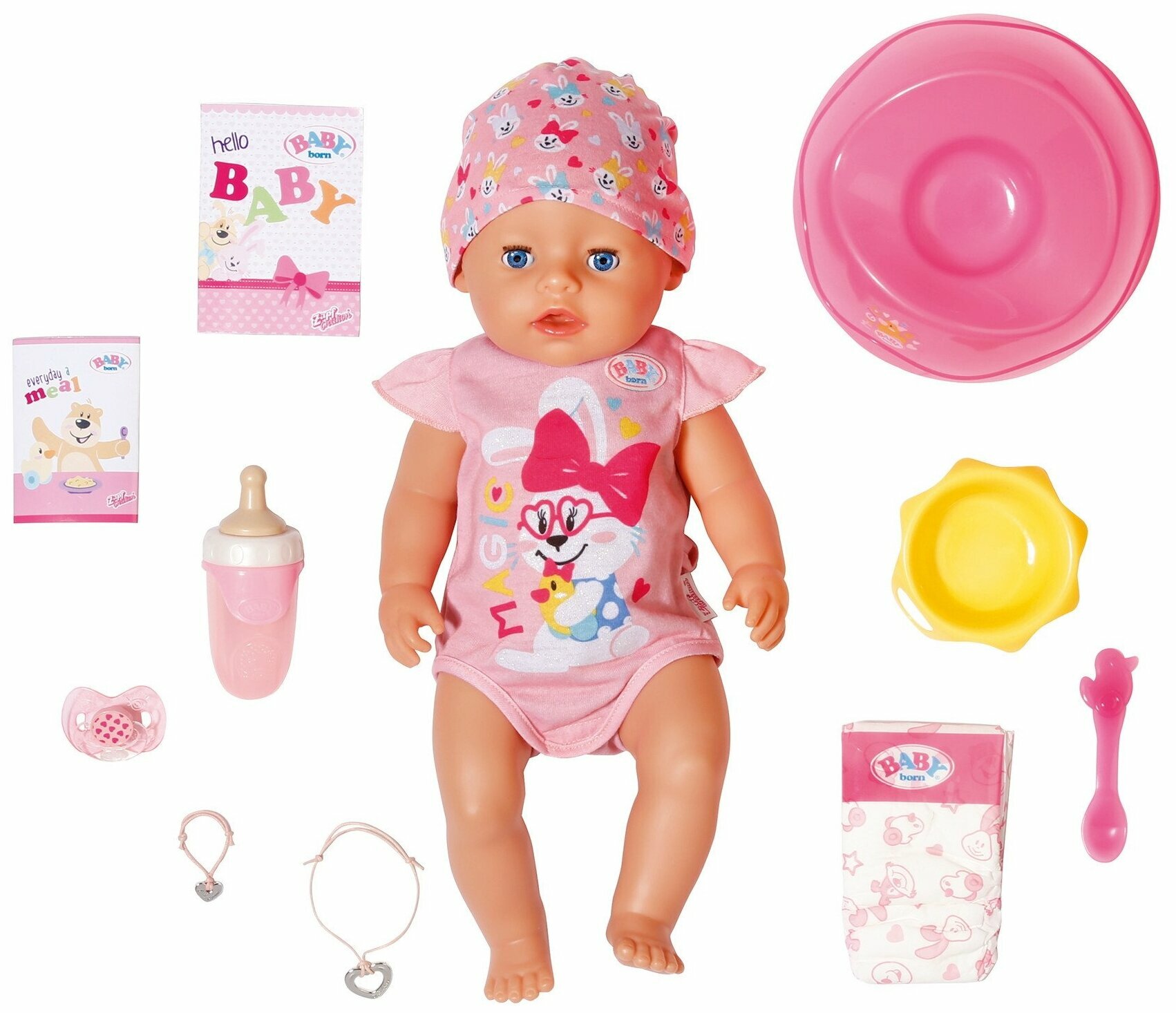 | В комплекте с куклой | бутылочка, пустышка, подгузник, тарелка, ложка, горшок, браслеты (свидетельство о рождении) |