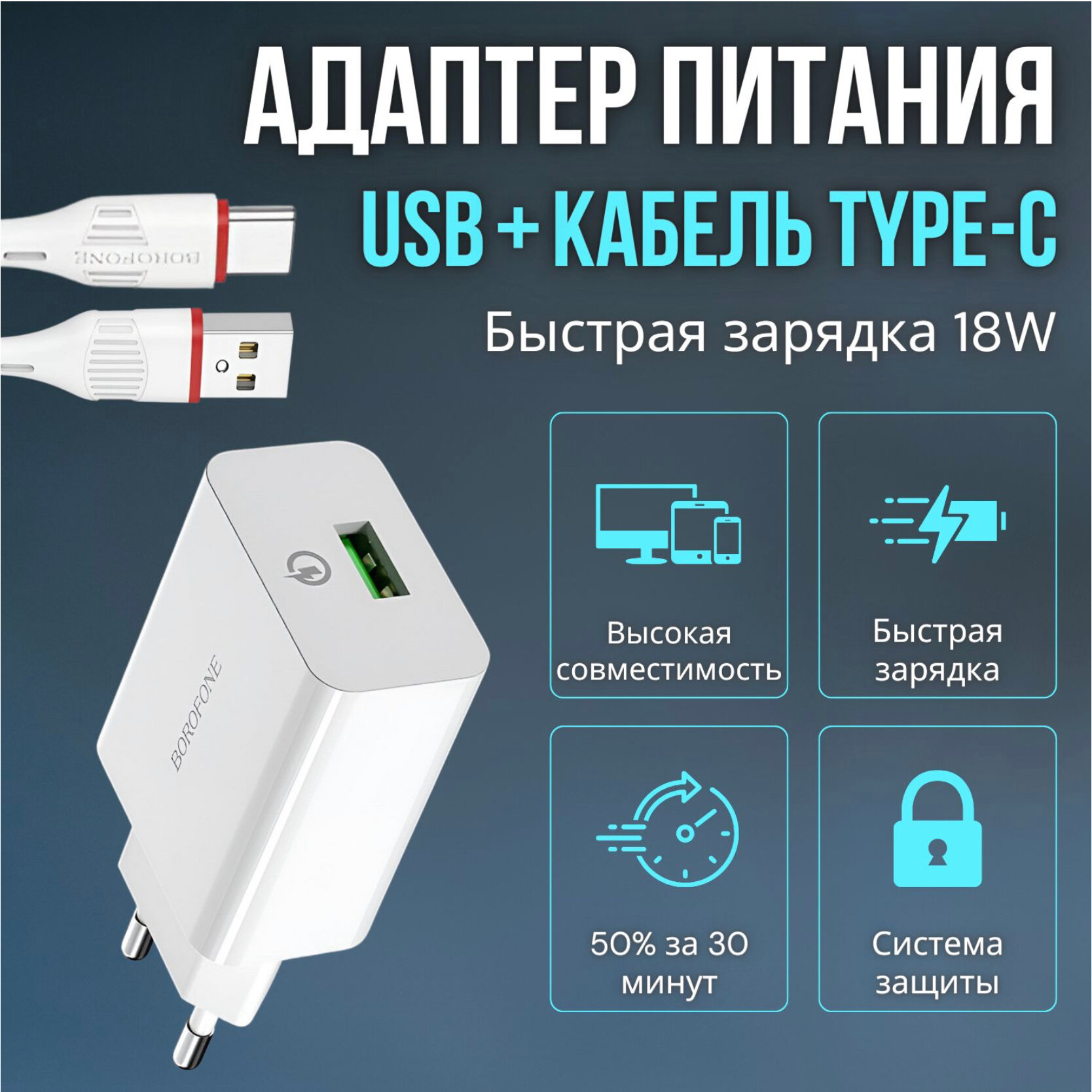 Сетевое зарядное устройство (СЗУ) Borofone BA21A QC 3.0 (USB) + кабель Type-C, 3 А, белый
