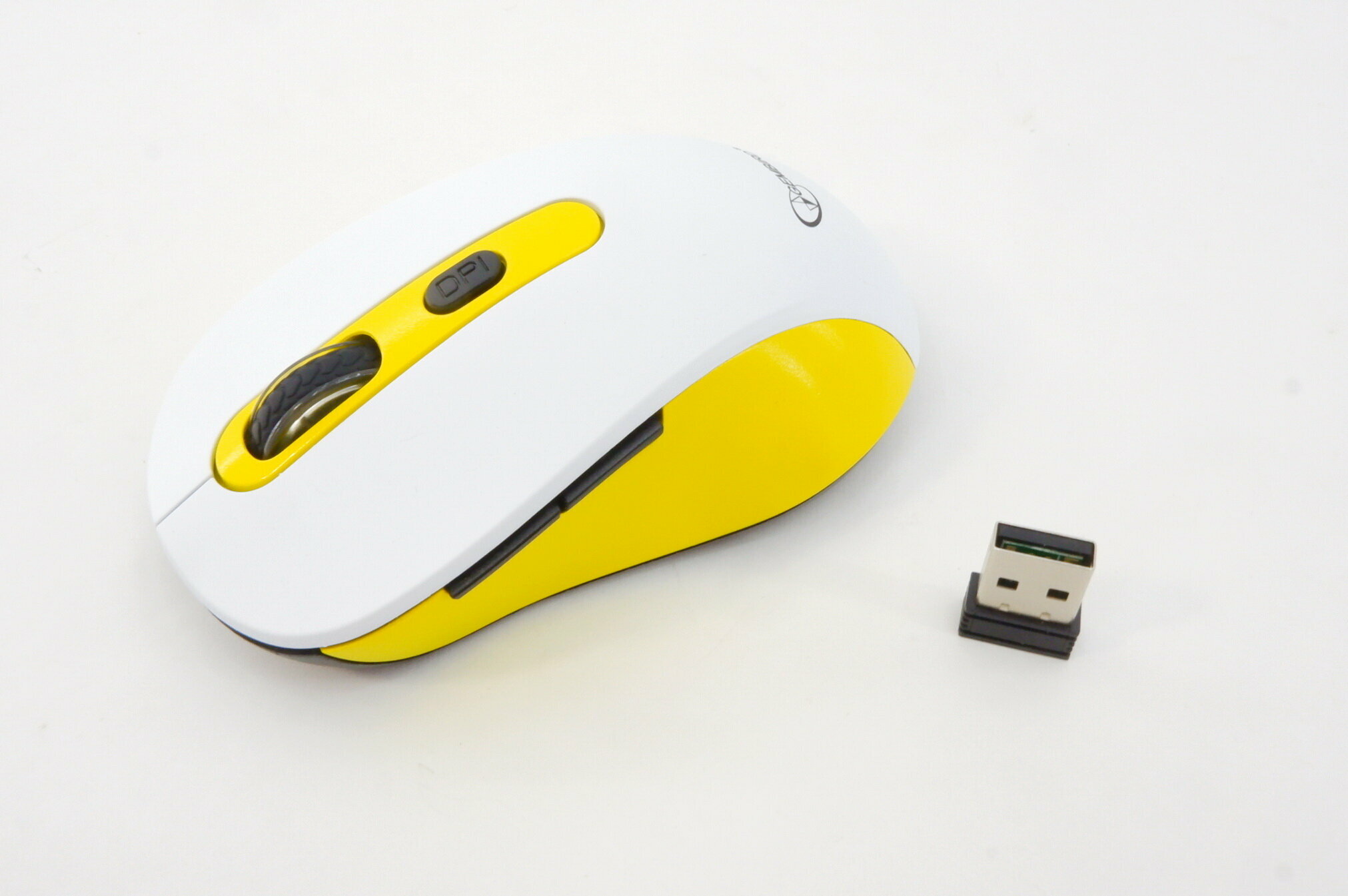 Лучшие цены. Мышь беспроводная usb Gembird энергосбарегающая, бело-желтая Мышь Gembird — это стильная компактная мышка с беспроводным подключением через интерфейс USB. Мышь Gembird идеально подходит для работы с ноутбуком. Мышка снабжена трёхуровневой системой энергосбережения. При этом питание мышки производится только от одной батарейки формата АА. Оптический сенсор имеет три уровня разрешения — 800-1200-1600 DPI. Магазины в вашем городе.
