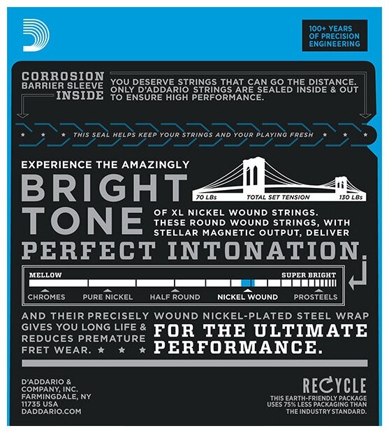 Лучшие цены. Струны D'Addario EXL140 с никелированной обмоткой для электрогитары, натяжение - Light Top/Heavy Bottom, калибр 10-52. Это один из наиболее популярных, гибридных комплектов D'Addario, сочетающий верхние струны из набора EXL110 (калибра .010) и струны (калибра .052). Такая комбинация обладает мощным низовым звуком, необходимым для пауэр-аккордов, а стальные струны без обмотки обеспечивают необходимую гибкость. Струны оптимизированы для пониженной настройки или настройки типа «drop». Магазины в вашем городе.