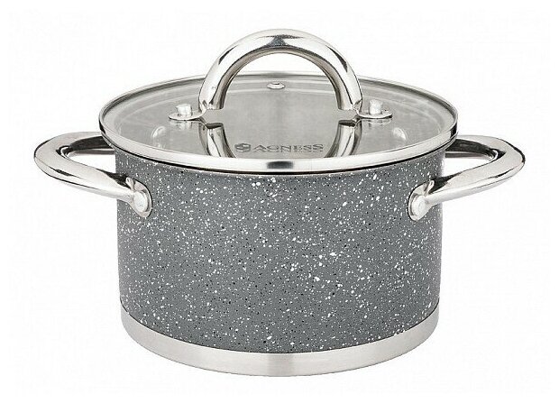 Лучшие цены. Кастрюля AGNESS со стеклянной крышкой, нерж. сталь, серия монблан 4,6Л 22Х12,5СМ Бренд AGNESS представляет кастрюли из нержавеющей стали серии Монблан. Изюминка этой серии - это внешнее жаропрочное покрытие выполненное под серый "мрамор" и обеспечивающее высокую износостойкость посуды. Энергосберегающее капсульное дно обеспечивает быстрый и равномерный нагрев посуды. Магазины в вашем городе.