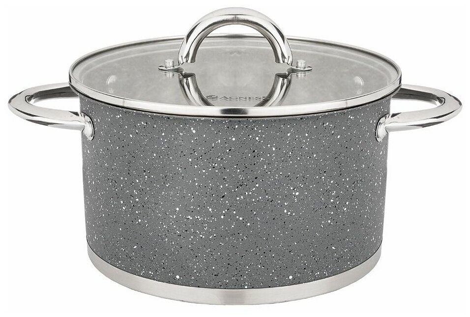 Лучшие цены. Кастрюля AGNESS со стеклянной крышкой, нерж. сталь, серия монблан 4,6Л 22Х12,5СМ Бренд AGNESS представляет кастрюли из нержавеющей стали серии Монблан. Изюминка этой серии - это внешнее жаропрочное покрытие выполненное под серый "мрамор" и обеспечивающее высокую износостойкость посуды. Энергосберегающее капсульное дно обеспечивает быстрый и равномерный нагрев посуды. Магазины в вашем городе.
