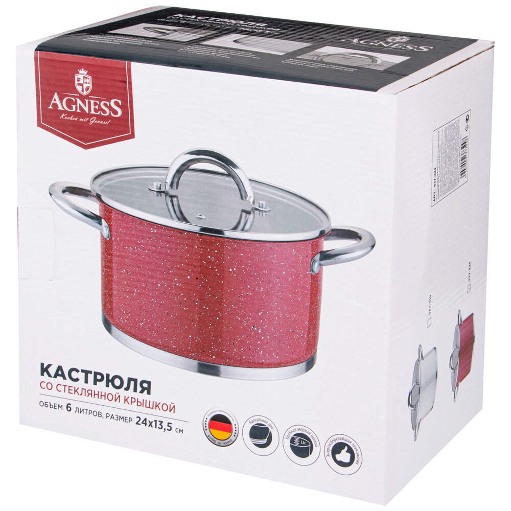Лучшие цены. Бренд AGNESS представляет кастрюли из нержавеющей стали серии Red Marble. Изюминка этой серии - это внешнее жаропрочное покрытие выполненное под красный "мрамор" и обеспечивающее высокую износостойкость посуды. Энергосберегающее капсульное дно обеспечивает быстрый и равномерный нагрев посуды. Многослойная структура капсульного дна позволяет накапливать тепло и быстро и равномерно распределять его по всей поверхности посуды, в результате блюда готовиться быстрее. Вы экономите электроэнергию и Ваше время. Магазины в вашем городе.