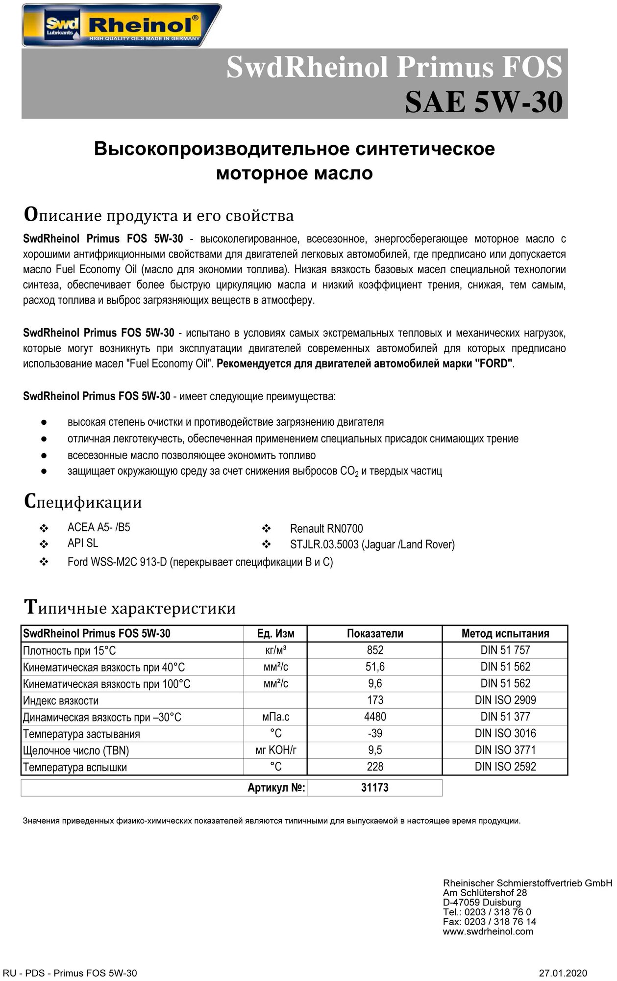 SWD RHEINOL 31173,180 Масло моторное Primus FOS 5W-30 1л