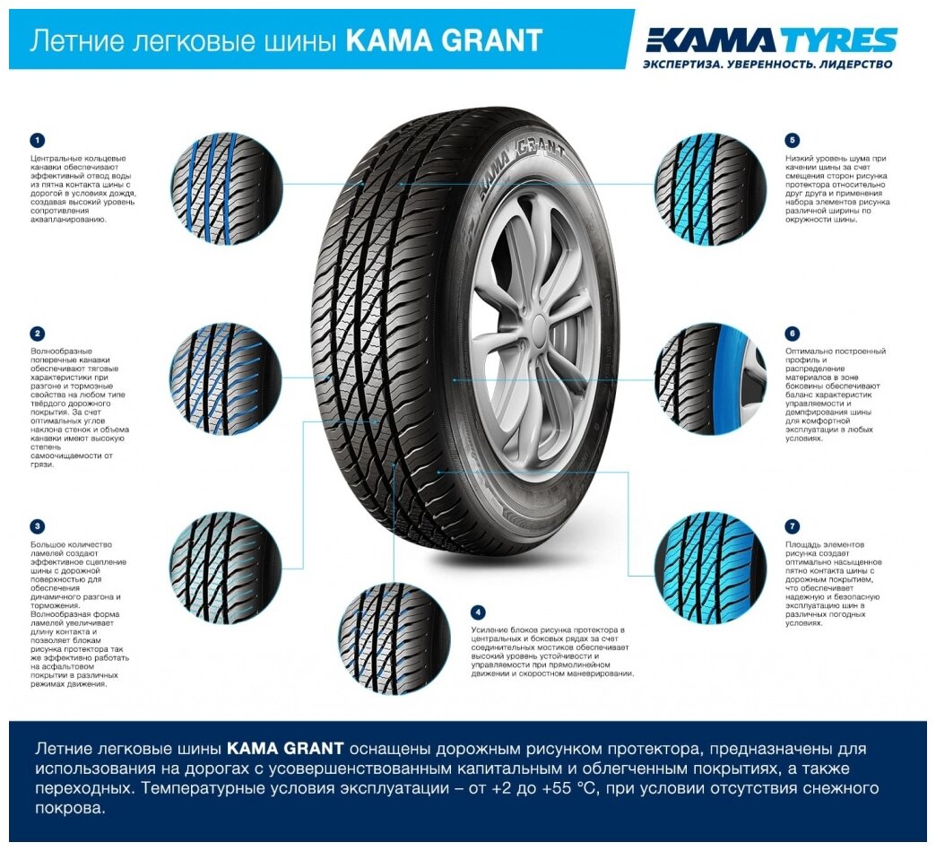 Лучшие цены. Шина KAMA GRANT предназначена для применения на легковых автомобилях при соблюдении скоростной и нагрузочных характеристик, соответствующих данной шине, на дорогах с усовершенствованным капитальным покрытием, с усовершенствованным облегченным покрытием и переходных, в климатических зонах при температуре окружающей среды от +2 до +55℃, при условии отсутствия снежного покрова. Шина - радиальной конструкции, бескамерная, с дорожным рисунком протектора. Магазины в вашем городе.