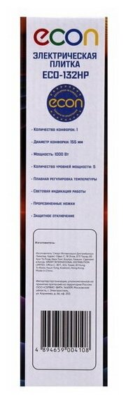 Лучшие цены. Электрическая настольная плитка Econ ECO-132HP выручит вас в ситуациях, когда нет возможности установить стационарную варочную панель. Прибор компактный и весит немногим более одного килограмма, так что для него будет несложно найти место на очень маленькой кухне, в общежитии, временном жилье и при необходимости перевезти. просто И надёжно Корпус этой модели сделан из прочной эмалированной стали, конфорка мощностью 1000 Вт – чугунная. Магазины в вашем городе.