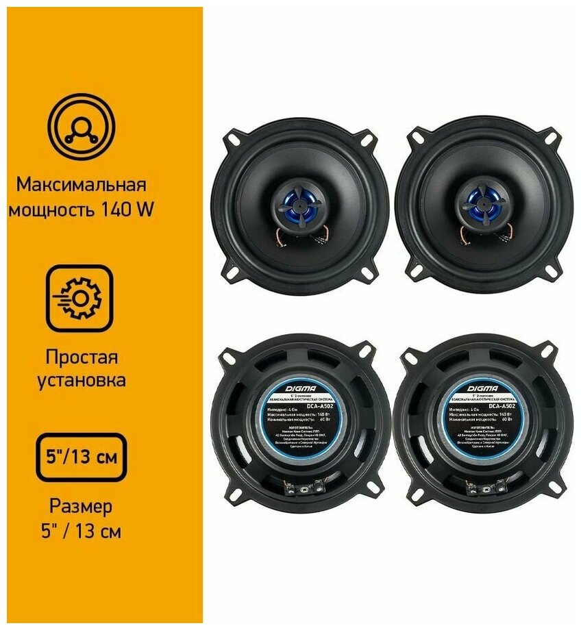 Колонки автомобильные DIGMA DCA-A502, 13 см (5 дюйм.), комплект 2 шт.