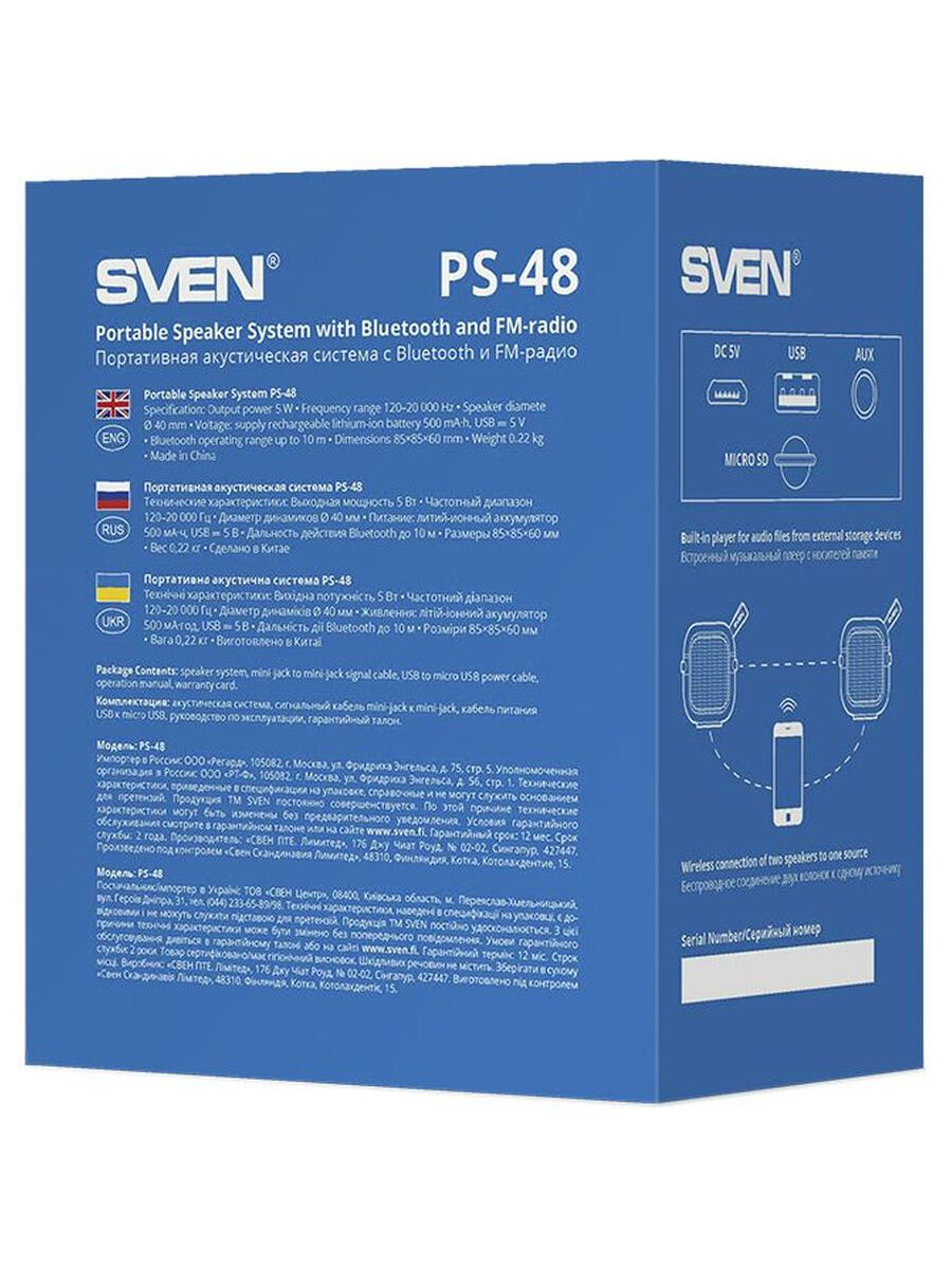 Акустическая система 1.0 SVEN PS-48, черный, мощность 5 Вт (RMS), TWS, Bluetooth, FM, USB, microSD, встроенный аккумулятор