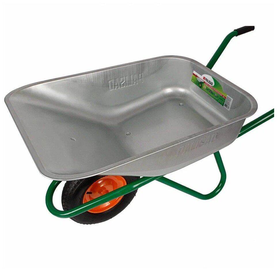 Лучшие цены. Усиленная садово-строительная тачка Palisad 689183, с объемным кузовом на 90 л и грузоподъемностью 200 кг, позволяет с удобством транспортировать строительные материалы, удобрения, урожай и др. грузы. Она станет незаменимым помощником в ходе строительных и сельскохозяйственных работ. Усиленная конструкция позволяет использовать тележку для интенсивной эксплуатации с большими объемами работ. Магазины в вашем городе.