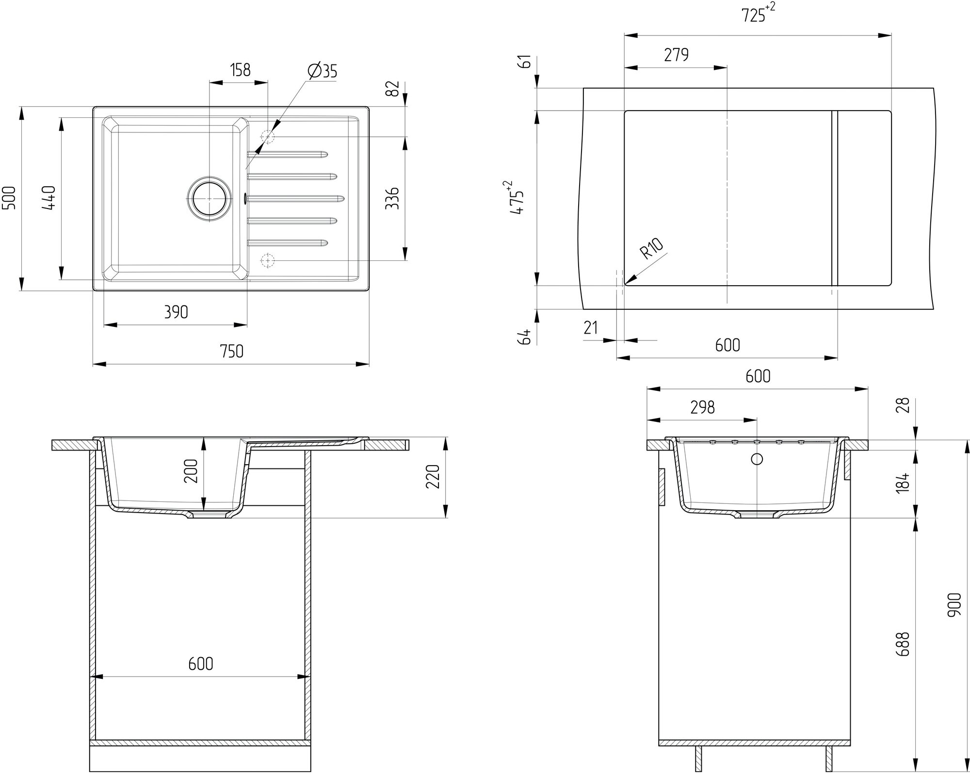 Мойка кухонная Ulgran из кварцевого композита прямоугольная Quartz Prima, цвет: уголь, база: 67.5х47.5 см, арт. Prima 700-07 12 581 ₽ Подробнее