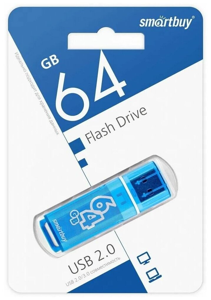 Лучшие цены. SMARTBUY Glossy - простой и в то же время стильный флеш-диск. Предоставляет место хранения для файлов: фотографий, видеозаписей, презентаций, текстовых документов и т. Д. Флеш-диск объемом 64 Гб комплектуется специальной системой для крепления колпачка — с помощью скобки он фиксируется между двумя выступающими пластинками на устройстве. Это очень удобно и минимизирует вероятность потери защитного колпачка. За эту же скобку флешку можно прикрепить к шнурку. Выполнен из прозрачного пластика синего цвета. Магазины в вашем городе.