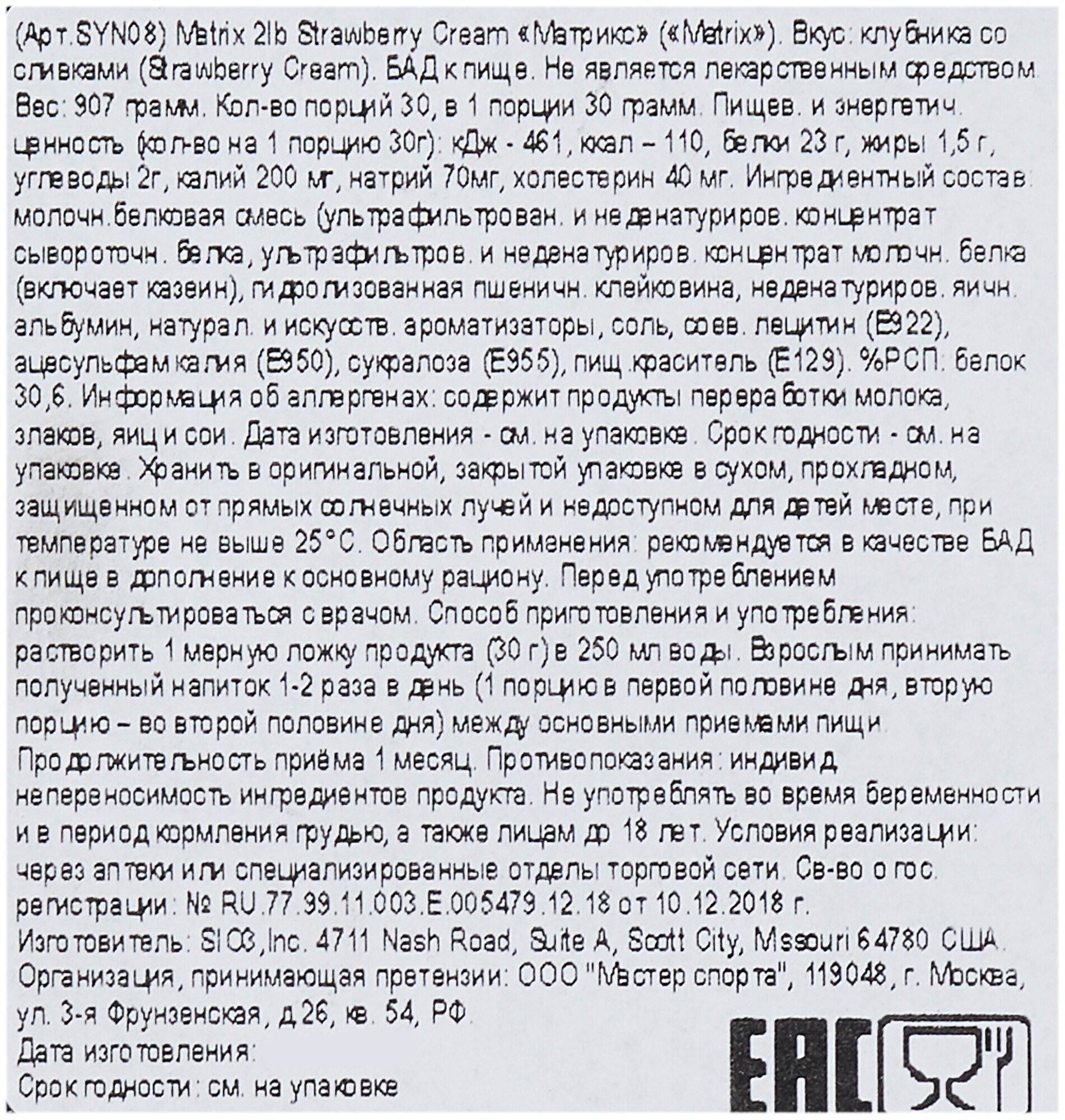 Лучшие цены. Для достижения наилучших результатов в Syntrax Matrix используется исключительно неденатурированный протеин высочайшего качества, такой как ультрафильтрованный сывороточный протеин, ультрафильтрованный молочный протеин, неденатурированный яичный белок, а также глютаминовые пептиды. Syntrax Matrix обладает отличным вкусом, улучшает здоровье организма в целом, положительно влияет на рост тканей и восстановительные процессы. Магазины в вашем городе.