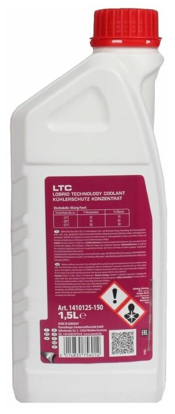 Лучшие цены. RAVENOL LTC Premix -40°C Protect C12++ - это экологически чистый антифриз для радиаторов охлаждающих контуров двигателей внутреннего сгорания на основе 1,2- этандиола (моноэтиленгликоля), который обеспечивает защиту от коррозии и замерзания, не требующую технического обслуживания. Продукт разработан на основе проверенной разработки ингибиторов путем сочетания силикатов с технологией органических добавок OAT в качестве долговременной защиты радиатора. Магазины в вашем городе.