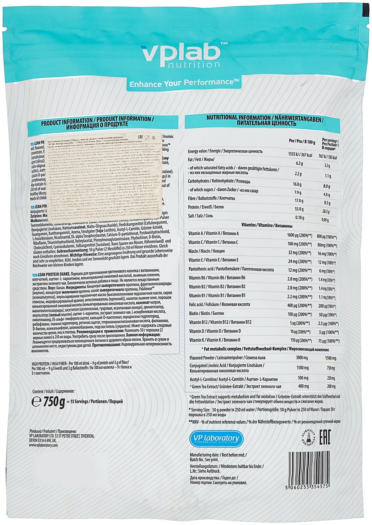Протеиновый коктейль, клетчатка, L-карнитин, CLA VPLAB Lean Protein Shake со вкусом банана, порошок в пакете массой 750 г
