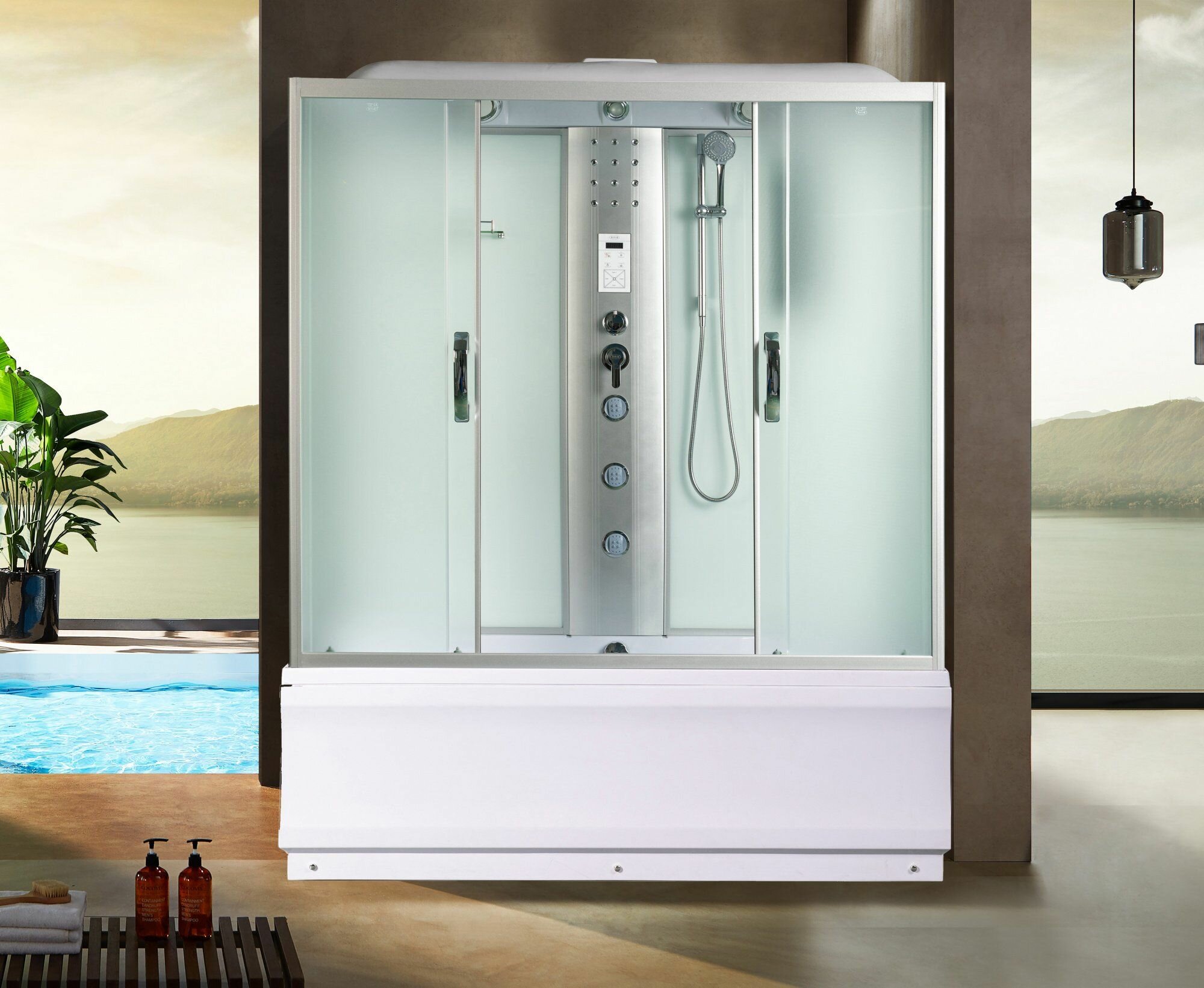 | Функции | гидромассаж вертикальный / гидромассаж ног / верхний душ (тропический) / озонирование / турецкая баня / подсветка / вентиляция / таймер |