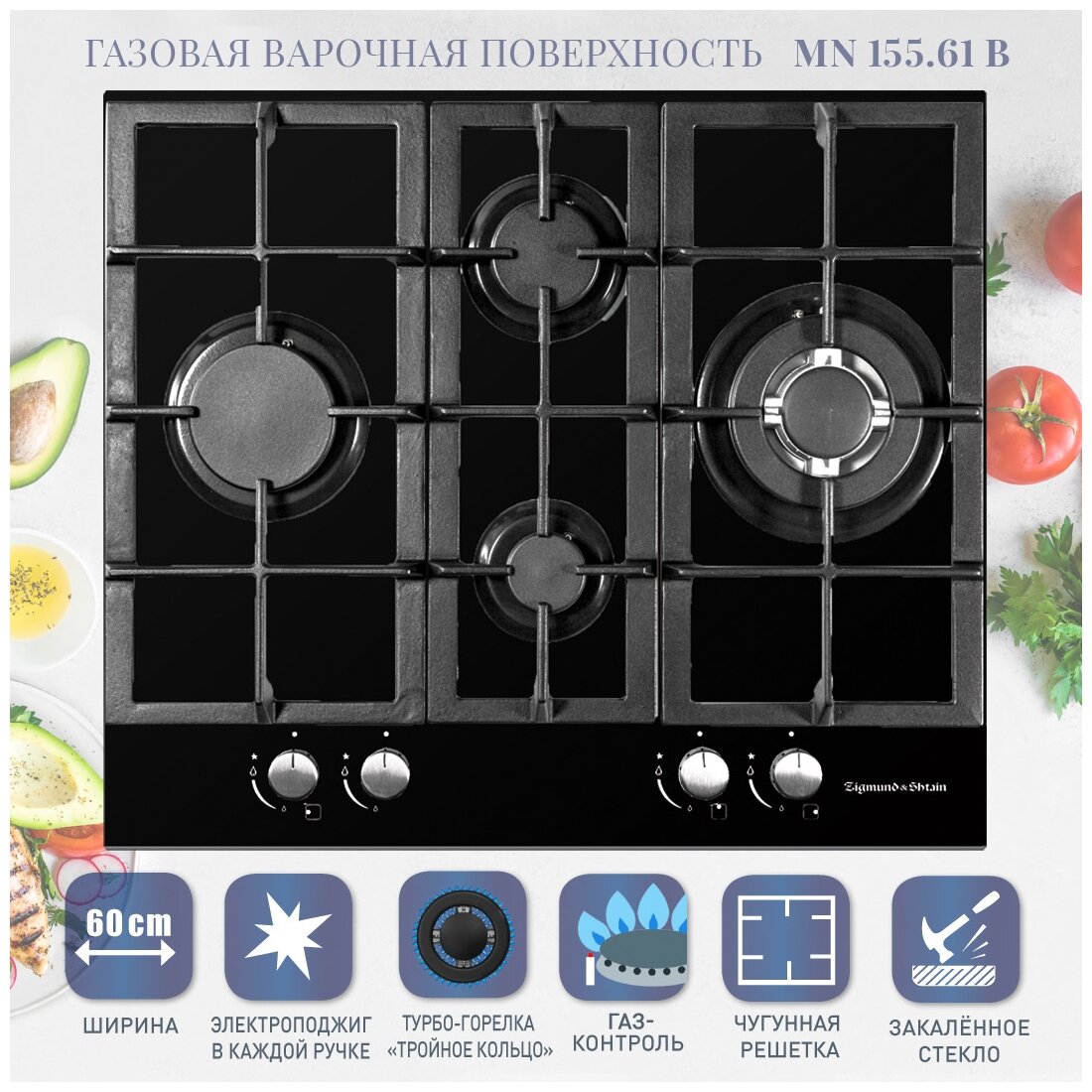 Лучшие цены. Газовая панель Zigmund Shtain MN 155.61 B выполненная из закаленного, ударопрочного стекла черного цвета, органично впишется в любой интерьер. Чугунные решетки обеспечат максимальную устойчивость посуды, а система «газ-контроль» позаботиться о Вашей безопасности, если пламя случайно погаснет. Так же в ручки управления интегрирован электроподжиг — теперь можно забыть о спичках, достаточно повернуть ручку и пламя зажжется от искры. Магазины в вашем городе.