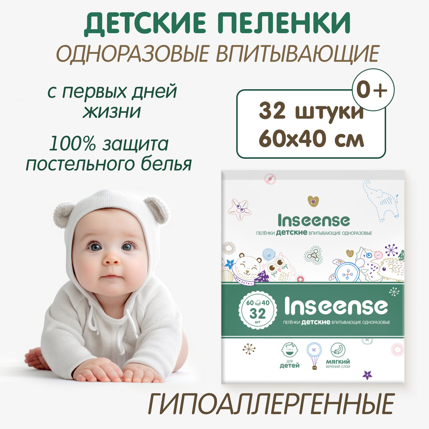 Пеленки INSEENSE впитывающие одноразовые 60х40 32 шт