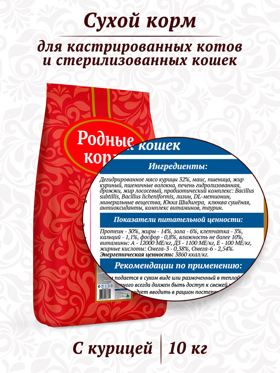 Лучшие цены. Сухой полнорационный корм премиум-класса для взрослых стерилизованных кошек Родные корма. Изготовлен с учетом их физиологических потребностей. В составе только натуральное российское сырье без ГМО, красителей и консервантов. Ингредиенты: Дегидрированное мясо курицы 32%, маис, пшеница, жир куриный, пшеничные волокна, печень гидролизованная, дрожжи, жир лососевый, пробиотический комплекс: Bacillus subtillis, Bacillus licheniformis, лизин, DL-метионин, минеральные вещества, Юкка Шидигера, клюква сушенная. Магазины в вашем городе.