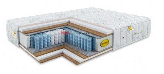 Лучшие цены. Высота 28 см. Уровень жесткости средний/выше среднего. Натуральный латекс 3 см, латексированное кокосовое волокно 1 см, термовойлок, независимый пружинный блок "Пчелиные соты" 600 пр./кв. м, термовойлок, латексированное кокосовое волокно 1 см, натуральный латекс 2 см, латексированное кокосовое волокно 1 см. Чехол из трикотажной ткани, простеган на синтепоне и материале с эффектом памяти. Максимальный вес на 1 спальное место 150 кг. Магазины в вашем городе.