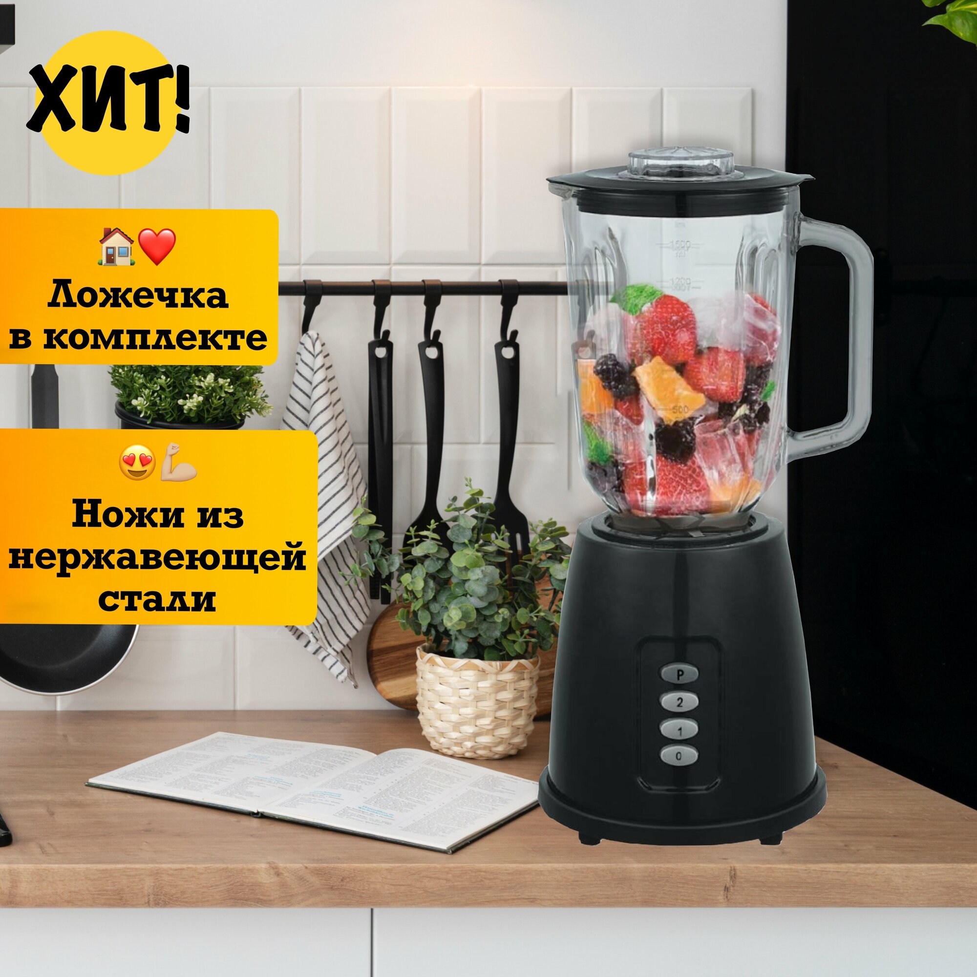 Миксеры и блендеры Блендер, блендер домашний, блендер стационарный, блендер для смузи, 1000 Вт, кувшин 1.5 литра, импульсный режим, 2 скорости работы, черный