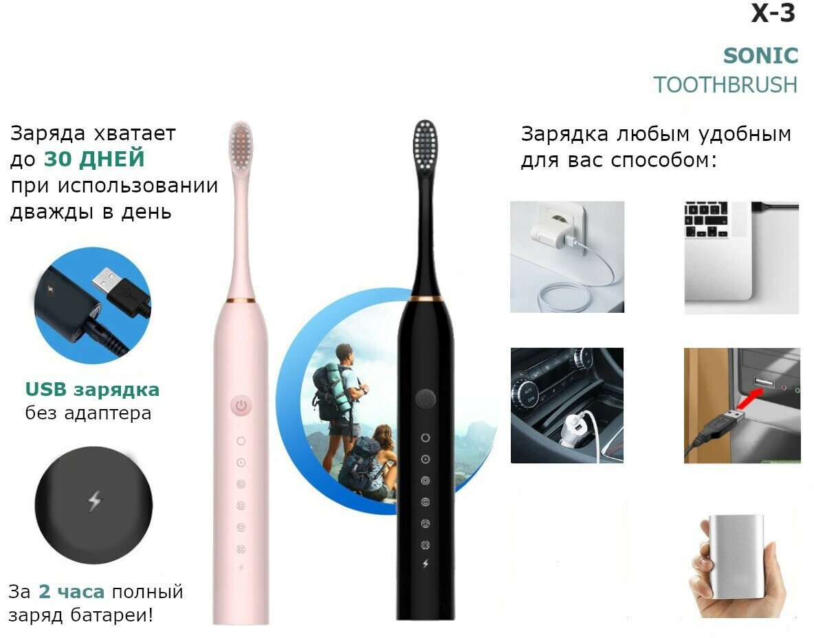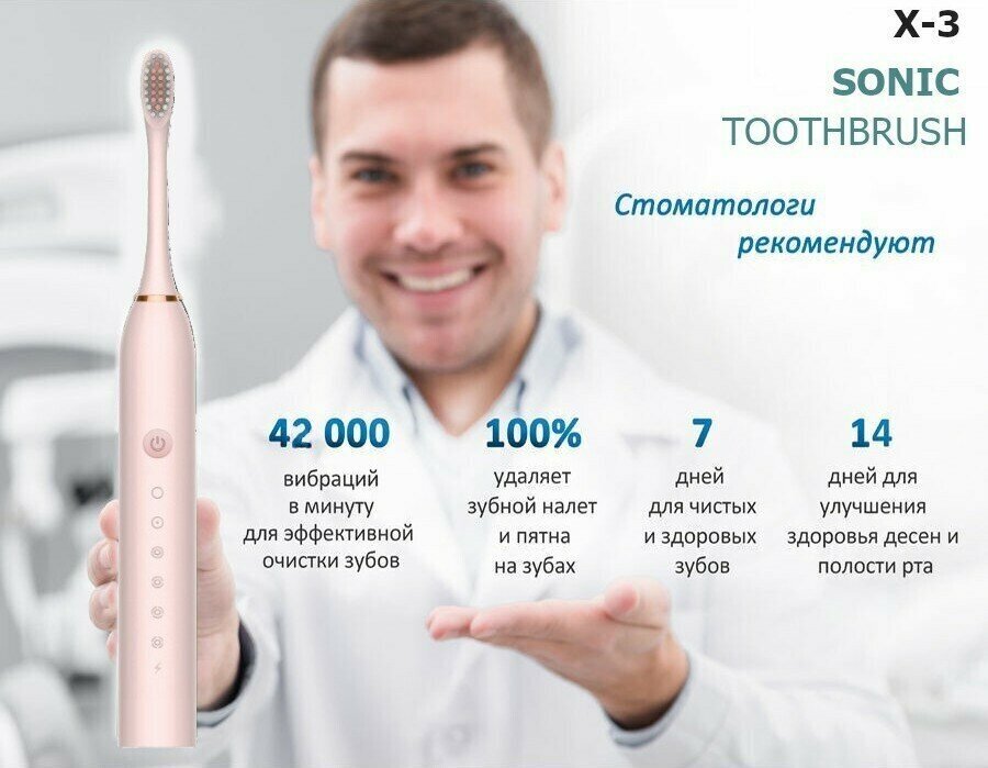 Лучшие цены. Преимущества электрической зубной щетки Smarter X-3. Удобнее. Для вашего удобства используйте зубную щетку Sonic Toothbrush X-3 обычной продолговатой формы, к которой вы привыкли с детства. Одной зарядки этой щетки хватит до 30 дней ежедневного использования. Кабель зарядки имеет USB разъем, что позволяет заряжать щетку от любого устройства с выходом USB: ноутбука, Power bank или использовать универсальный адаптер, который вы используете для зарядки телефона и тд. Магазины в вашем городе.