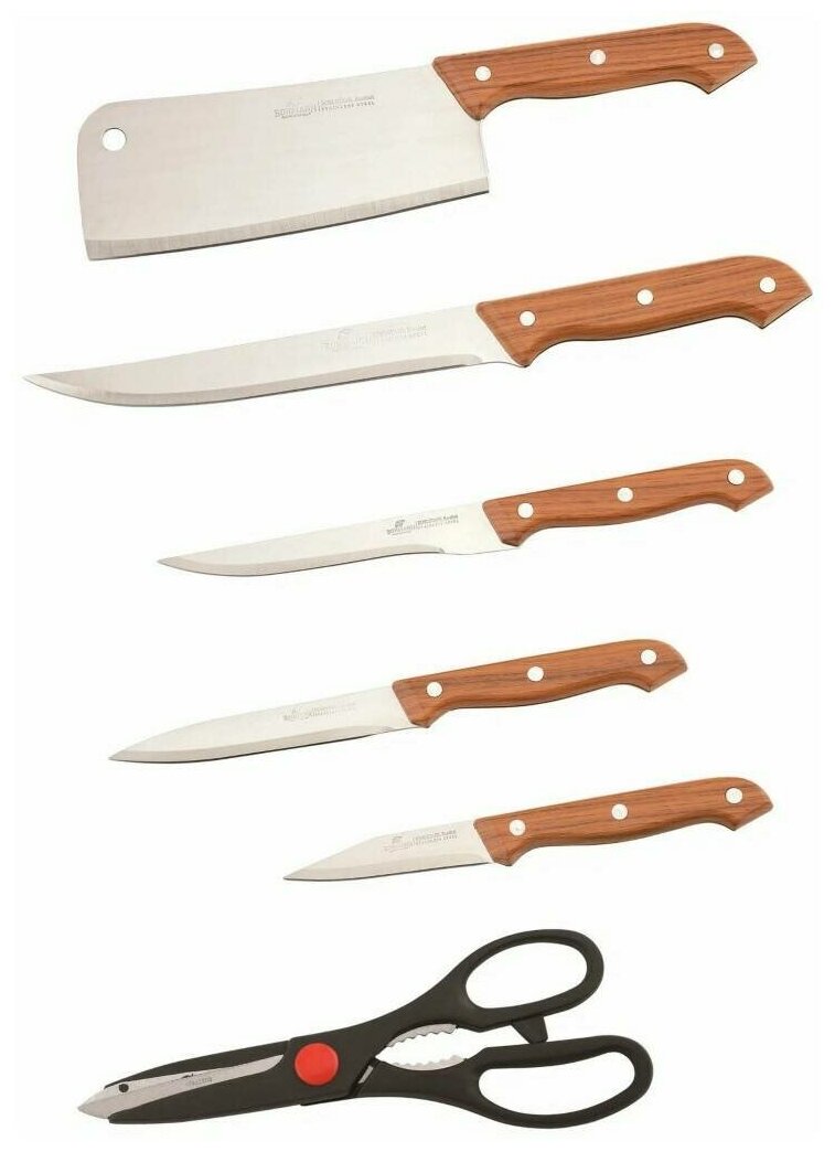 Лучшие цены. Набор ножей 7 предметов из нержавеющей стали, эргономичные рукоятки. В набор входит: кухонный топорик, нож для мяса, разделочный нож, обвалочный нож, нож для снятия кожуры, ножницы, деревянная подставка. Магазины в вашем городе.