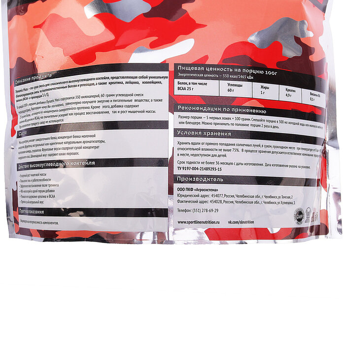 Лучшие цены. Гейнер SportLine Dynamic Mass — это высококалорийный, легко- и быстроусвояемый углеводно-белковый продукт, предназначенный для использования в качестве дополнительного приема пищи или как заменителя пищи для поднятия общей калорийности рациона на этапе набора мышечной массы. Действие высокоуглеводного коктейля: Ускоренный рост мышечной массы. Эффективное восстановление после тренинга. Повышенное содержание креатина и ВСАА. Повышение силы и работоспособности. 350 килокалорий в одной порции добавки. Магазины в вашем городе.