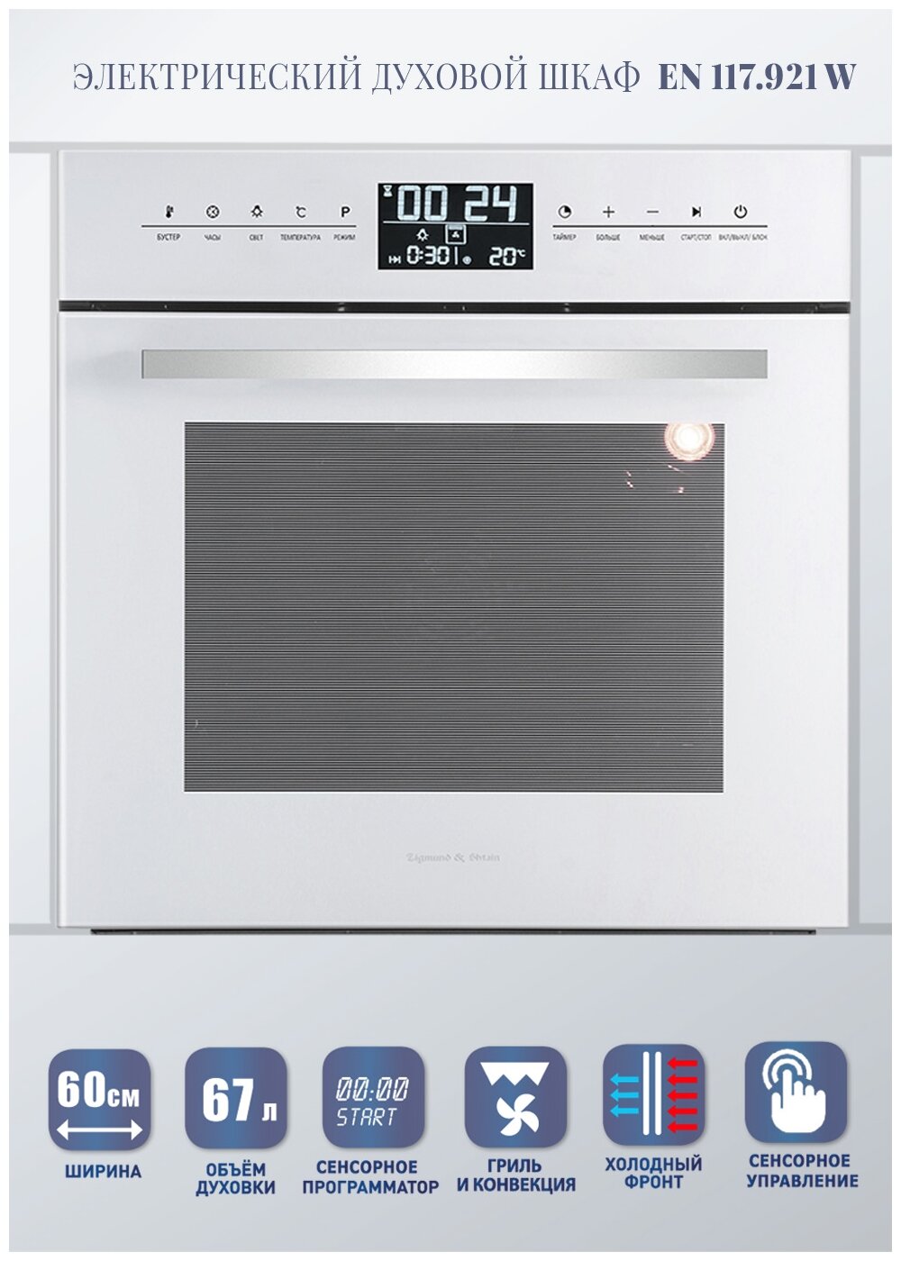 Лучшие цены. Электрический независимый духовой шкаф Zigmund & Shtain EN 117.921 W Особенности: Электрическая мультифункциональная духовка Тангенциальное охлаждение Панорамное внутреннее стекло дверцы Smart Eye Три съёмных стекла дверцы Доводчик дверцы Быстрый разогрев Блокировка от детей Холодный фронт Сенсорный программатор с широким дисплеем Сенсорное управление духовкой Хромированные боковые направляющие Телескопические направляющие Металлическая ручка дверцы Эмаль лёгкой очистки 1 решётка 2 противня Функции. Магазины в вашем городе.