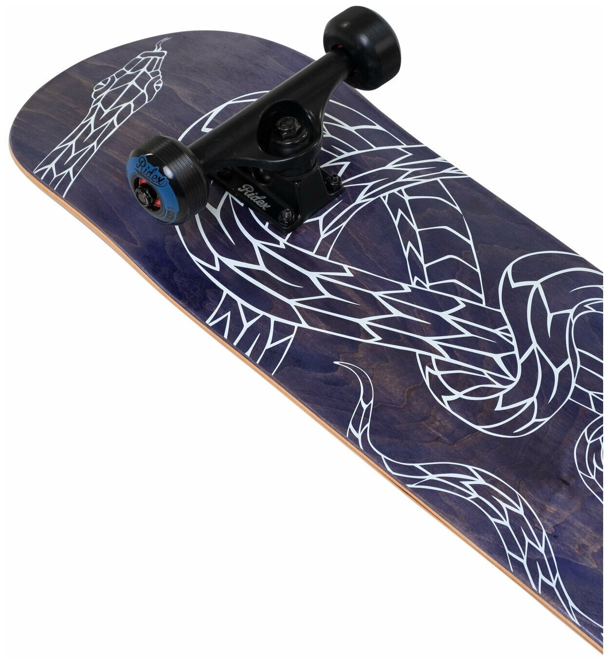Лучшие цены. Стильный и заметный новичок в семье RIDEX! Дизайн скейтборда Tempt придаст тебе уверенности и привлечет к себе все внимание на площадке.\nВ сложных трюках тебе поможет крепкая дека из 7 слоев канадского клена, которая способна выдерживать высокие нагрузки. Изюминку деке трюкового скейта добавляет окрашенный в синий цвет нижний слой, позволяющий увидеть натуральную структуру благородного дерева. Магазины в вашем городе.