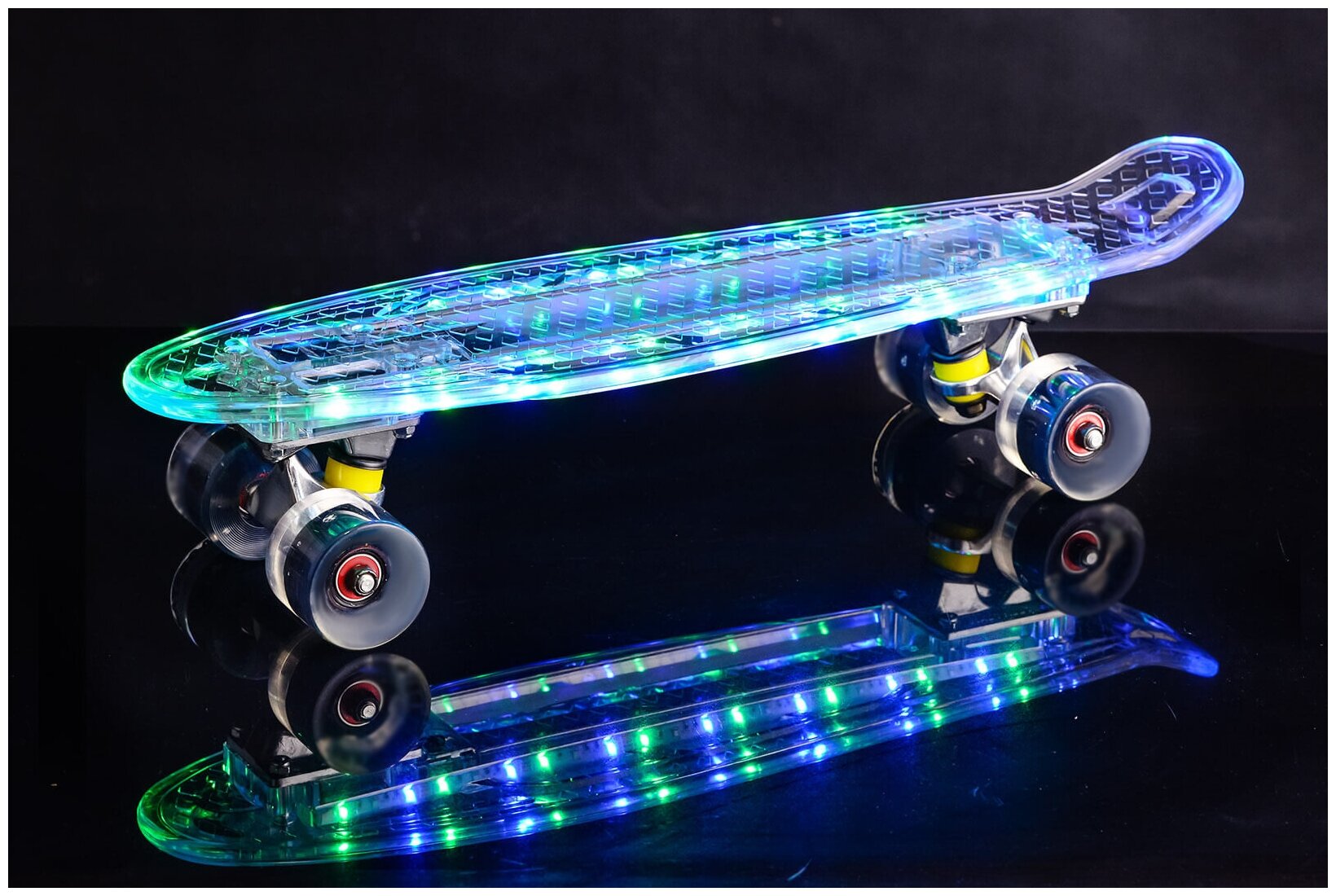 Лучшие цены. Cовременный модный светящийся скейтборд для мальчиков и девочек. Разные цвета скейта смогут удовлетворить потребности каждого ребенка. Борд изготовлен из ударопрочного пластика. Скейтборд с яркой подсветкой можно выбирать режимы. 11 режимов подсветки создадут веселое настроение во время катания. Характеристики модели: дека 22 дюйма; с подветкой (11 режимов); алюминиевые крепления; колеса PU с функцией подсветки; подшипник Abec 7. Магазины в вашем городе.