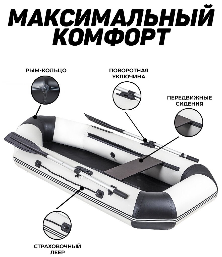| Дополнительно | клапан спуска воды / ручки для переноски / поворотные уключины / рым / леерный трос |
