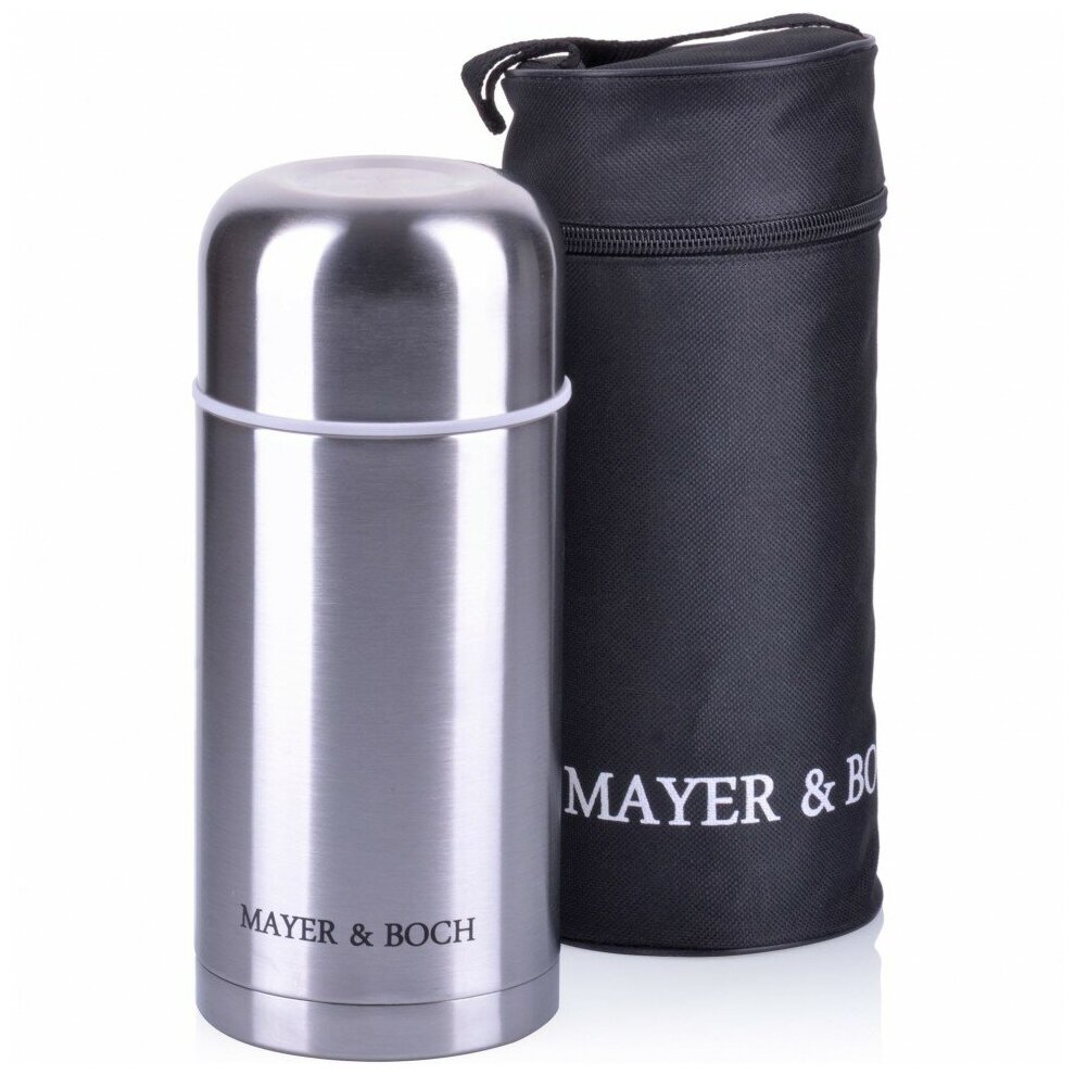 Лучшие цены. Термос с чехлом MAYER&BOCH выполнен из качественной нержавеющей стали, которая не вступает в реакцию с содержимым термоса и не изменяет вкусовых качеств напитка. Двойная стенка из нержавеющей стали сохраняет температуру на срок до 6-ти часов. Вакуумный закручивающийся клапан предохраняет от проливаний. Данная модель термоса прочная, долговечная и в тоже время легкая. Стильный металлический термос понравится абсолютно всем и впишется в любой интерьер кухни. Легко и просто моется. Магазины в вашем городе.