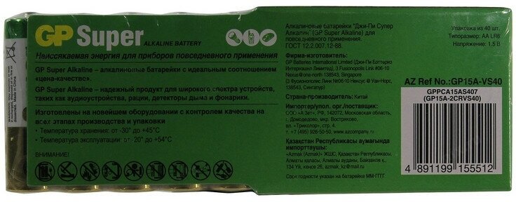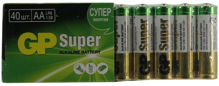 Батарейки GP Super, AA (LR6, 15А), алкалиновые, пальчиковые, комплект 40 шт., 15A-2CRVS, GP 15A-2CRVS40