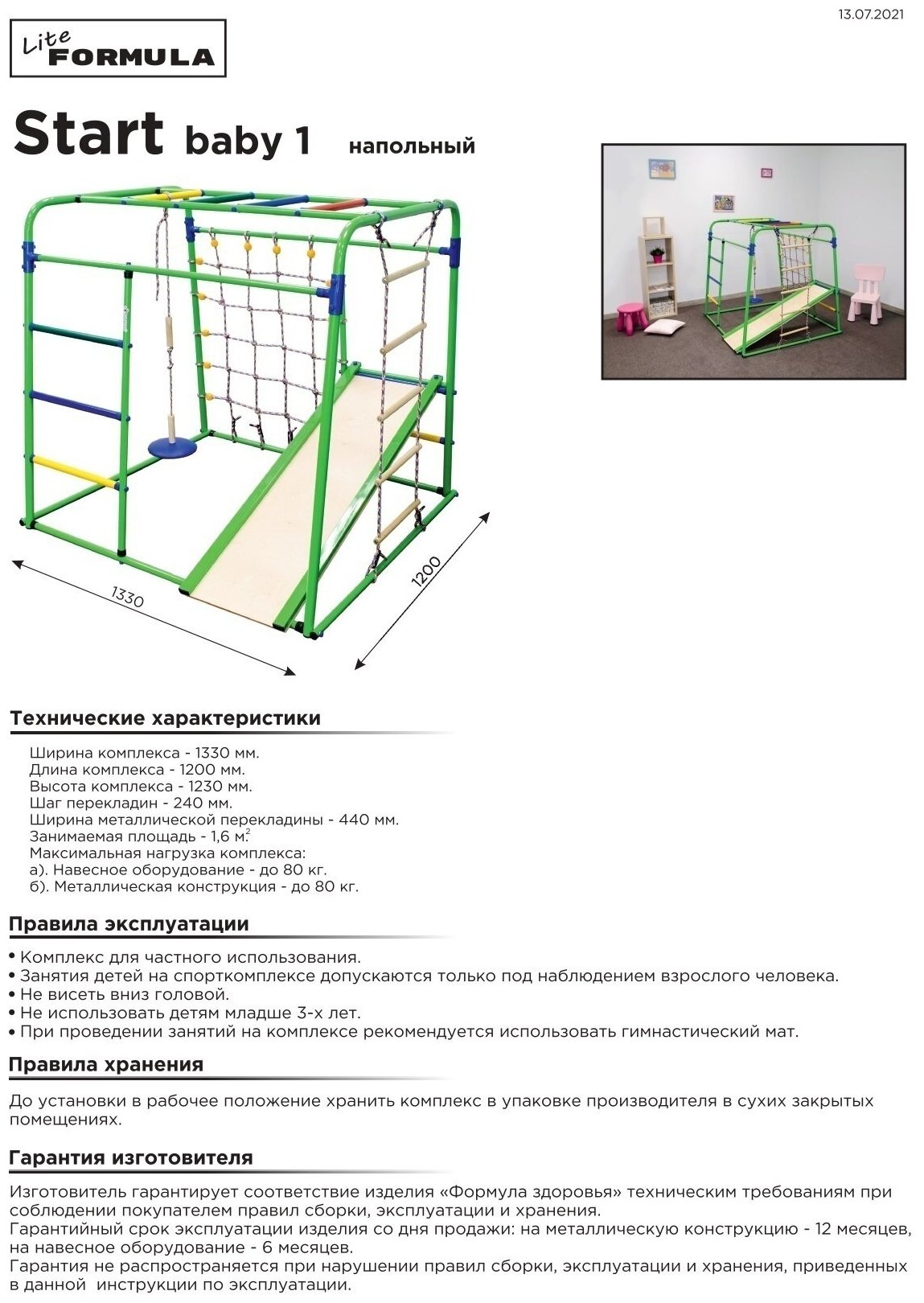 Детский спортивный комплекс для дома напольный игровой Формула здоровья Start baby 1 Плюс салатовый/радуга