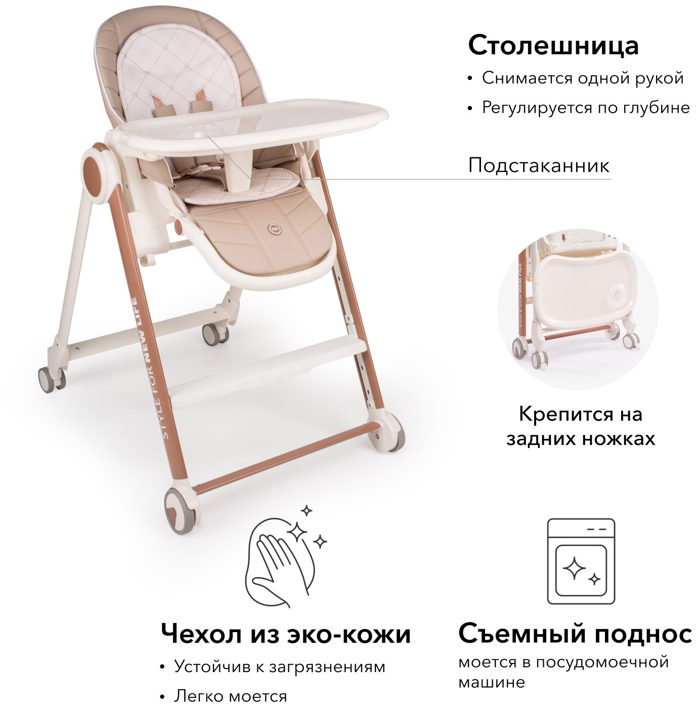 | Дополнительно | съемный столик / съемный поднос / столешница с бортиком / ремни безопасности |