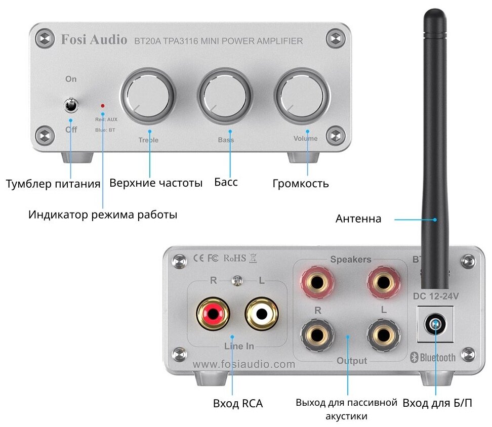 AV-ресиверы Усилитель для колонок Fosi Audio BT20A 100 Вт серебристый, с блоком питания 24 В