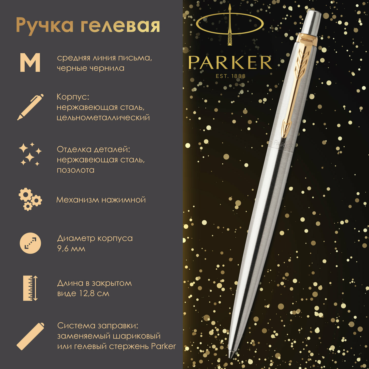Ручка паркер гелевая подарочная Parker Jotter Stainless Steel Gt, корпус серебристый, позолоченные детали, черная, 142843