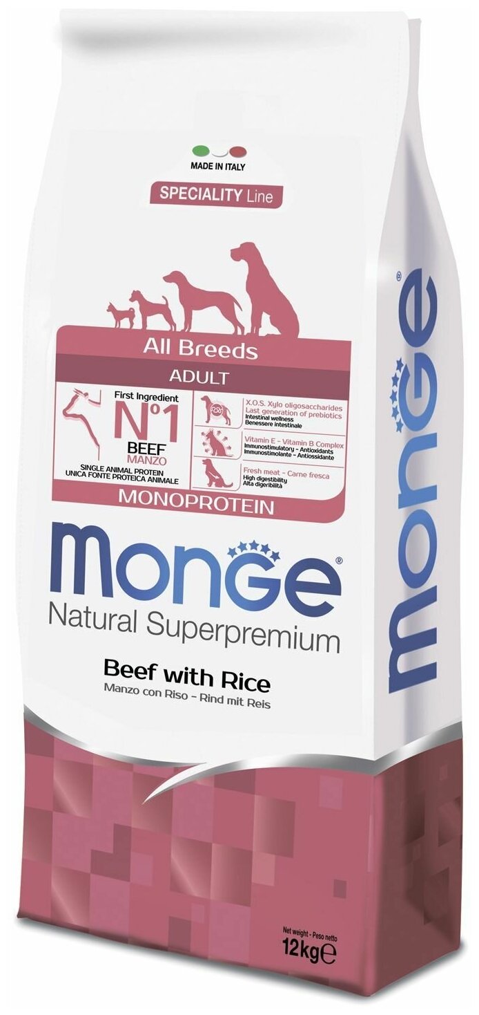 Сухой корм для собак Monge Speciality line all breeds adult monoprotein beef&rice, с говядина, с рисом, 12 кг