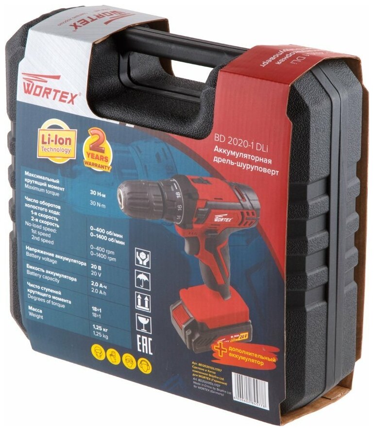 Аккум. дрель-шуруповерт WORTEX BD 2020-1 DLi в чем. (20.0 В, 2 акк., 2.0 А/ч Li-Ion, 2 скор., 30 Нм, шурупы до 9 мм) (BD20201DLi1707)