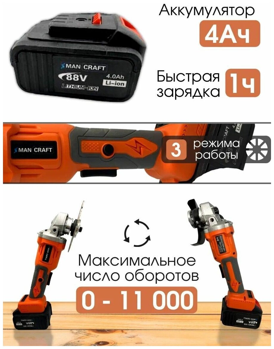 Лучшие цены. Профессиональная аккумуляторная углошлифовальная машина MANCRAFT применяется для резки и шлифовки на любых поверхностях: металлических, каменных, деревянных. Используется для обработки кравцовки и не только. Скоростное зарядное устройство обеспечивает быструю зарядку в течение 1 часа! Эта шлифовальная машина может работать автономно до 2 часов, поэтому можно с легкостью брать ее в места, где сеть недоступна. Мощность 1000W, аккумулятор 4 Ач 88V, размер диска 125мм, что дополнительно упрощает работу. Магазины в вашем городе.