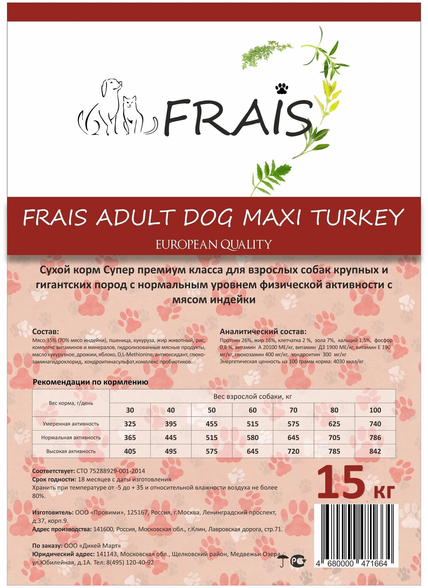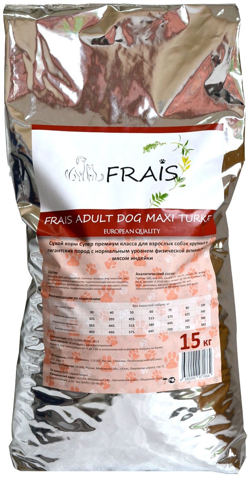 Корм для собак Frais корм для собак крупных и гигантских пород с нормальным уровнем активности, с мясом индейки 15 кг