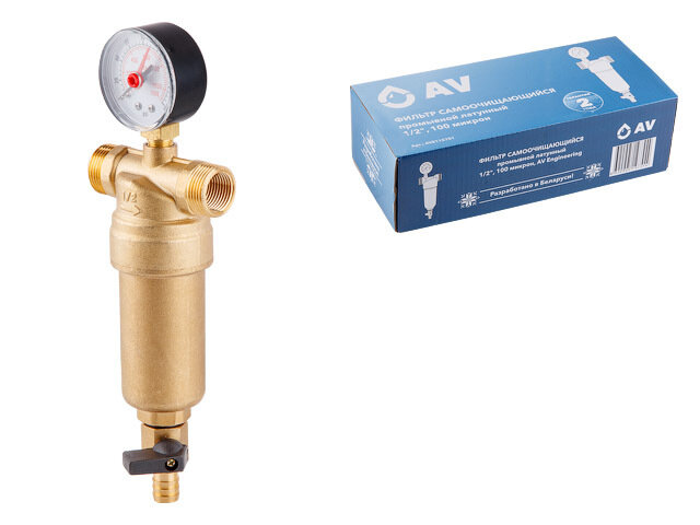 Магистральный фильтр для горячей воды самоочищающийся промывной латунный 1/2", 100 микрон, с манометром AV Engineering (AVE115701) 3 093 ₽ Подробнее