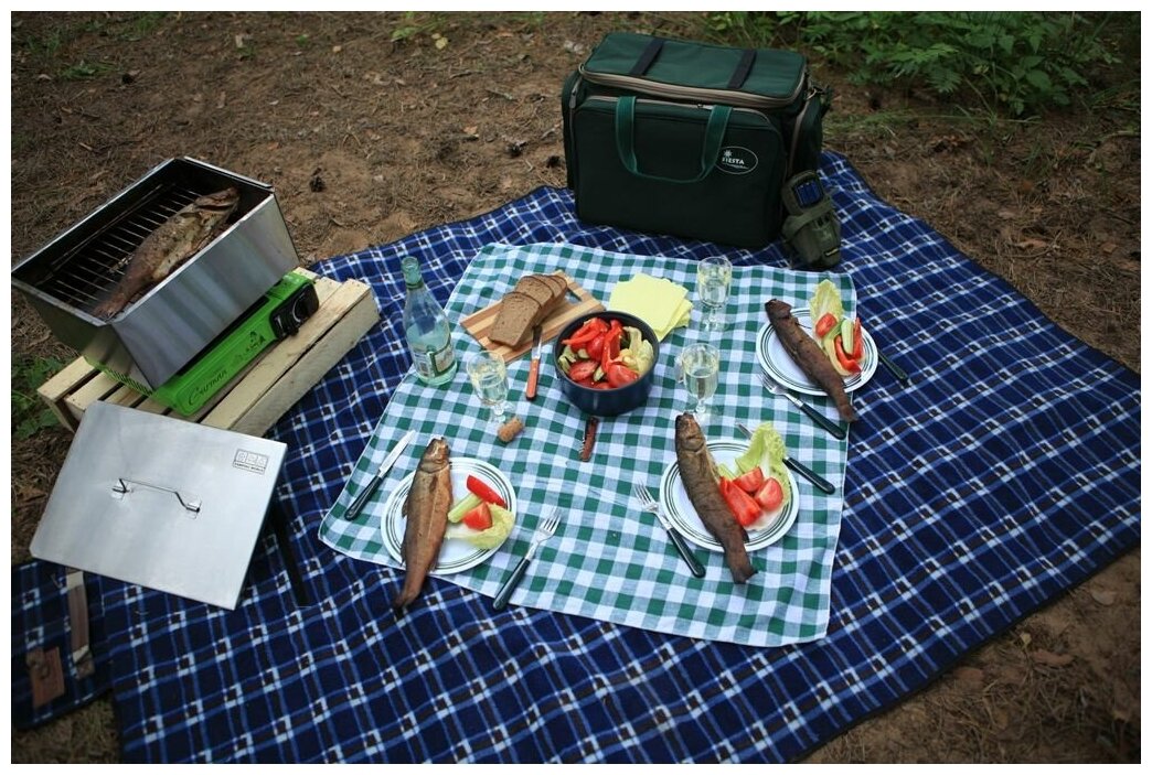 Лучшие цены. Описание: Замечательный органайзер для любителей комфортно выпить и закусить на природе! Удобная сумка с большим количеством внешних и внутренних карманов. Очень большой объем изотермического отделения для продуктов. Этот пикниковый набор идеально подходит для больших компаний. Технические характеристики: - размер - 42х33х29 см; - состав набора - 4 тарелки, 4 салфетки, 4 ложки, 4 вилки, 4 ножа, 4 бокала, скатерть, разделочная доска, открывалка для бутылок, разделочный нож, сумка с изотермическим отделением. Магазины в вашем городе.