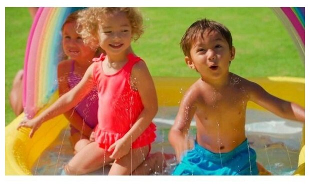 Лучшие цены. Надувной игровой бассейн - отличное решение, чтобы развлечь вашего ребенка и подарить ему чудесное настроение на весь день. Красочный дизайн с яркой радугой-дугой приведет в восторг и девочек, и мальчиков. Для работы фонтанчика вам понадобится обычный садовый шланг, который нужно подключить к специальному отверстию в детском бассейне. Малыши с удовольствием будут плескаться в воде и играть на открытом воздухе. Характеристики: Размер: 147x130x86 см; высота бортиков 10 см. Материал: винил, толщина 0.25 мм. Магазины в вашем городе.