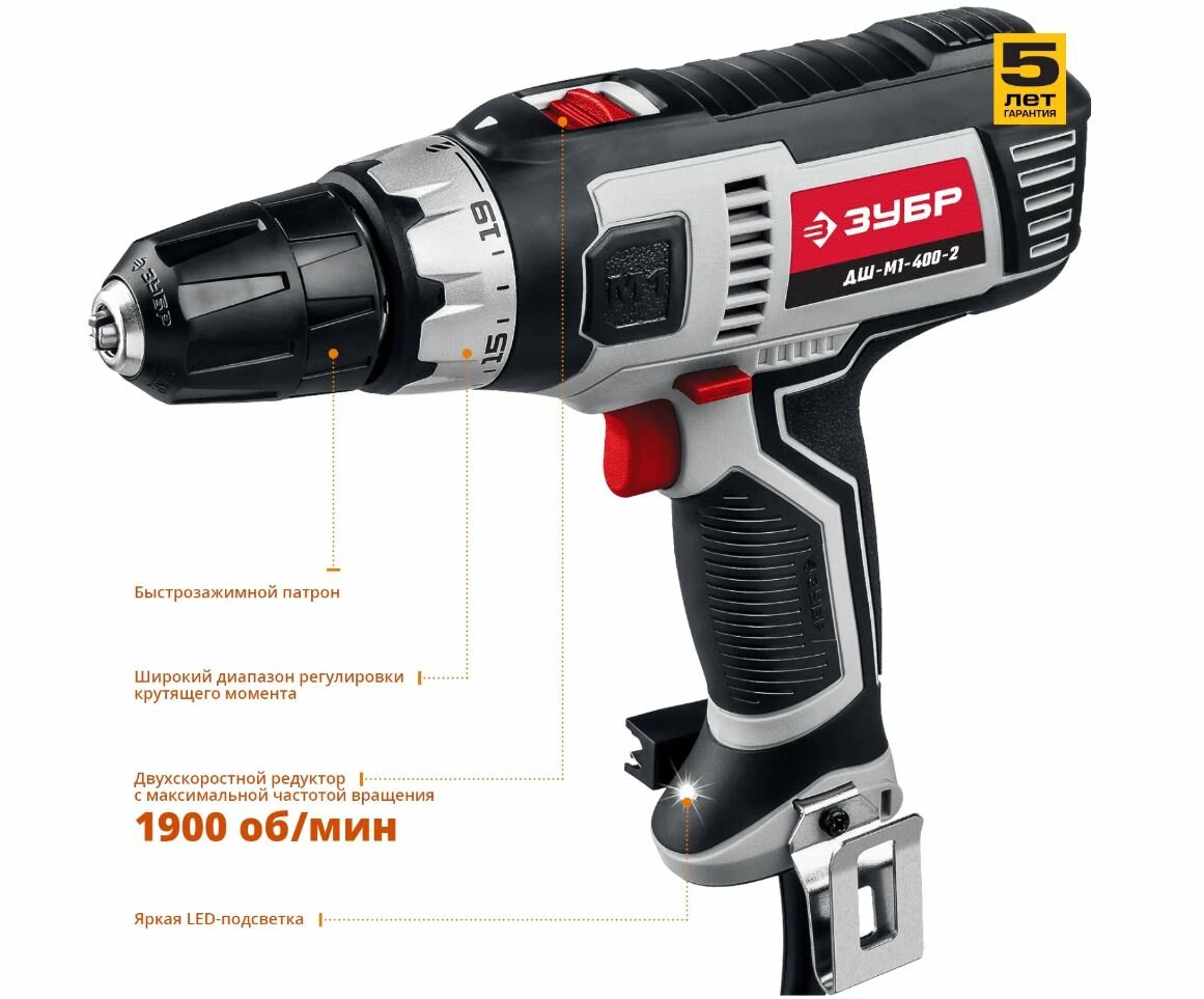 ЗУБР 400 Вт, 40 Н·м, сетевая дрель-шуруповерт (ДШ-М1-400-2)